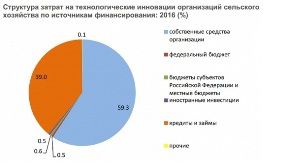 Инновационная деятельность преимущественно реализуется за счет собственных средств предприятий, составляющих 59,3% в общей структуре затрат на технологические инновации. Второе место среди источников финансирования занимают кредиты и займы (39%), поскольку сельскохозяйственные предприятия зачастую не имеют достаточных финансовых ресурсов для осуществления долгосрочных инвестиций. Вклад других источников минимален: бюджетная поддержка суммарно обеспечивает лишь 1,1% затрат на технологические инновации (в том числе, 0,5% — за счет средств федерального бюджета; 0,6% — за счет средств бюджетов субъектов РФ и местных бюджетов); иностранные инвестиции — 0,5%.