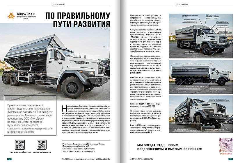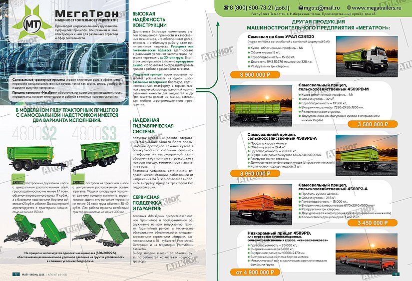 Машиностроительный завод «МегаТрон» был основан в 2013 году в Республике Татарстан, г. Набережные Челны. Предприятие производит широкую линейку прицепов, полуприцепов, спецтехники и комплектующих к ним, для различных отраслей и сфер деятельности: сельскохозяйственной, дорожной-строительной, горнодобывающий, лесозаготовительной. Дилерская и сервисная сеть представлена в 18 регионах России, в Казахстане и Республике Беларусь. ющий, лесозаготовительной.