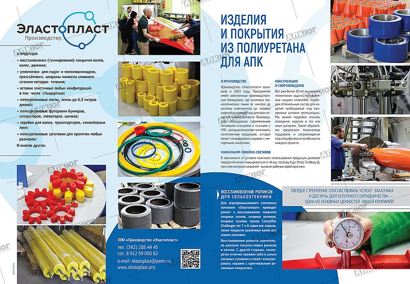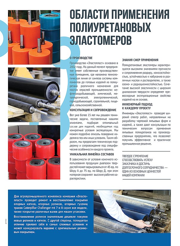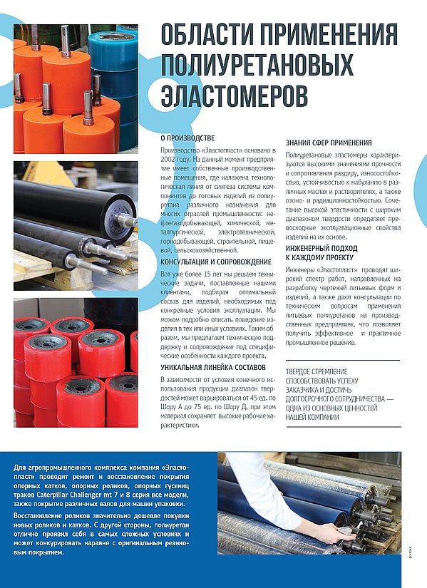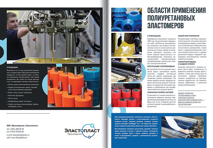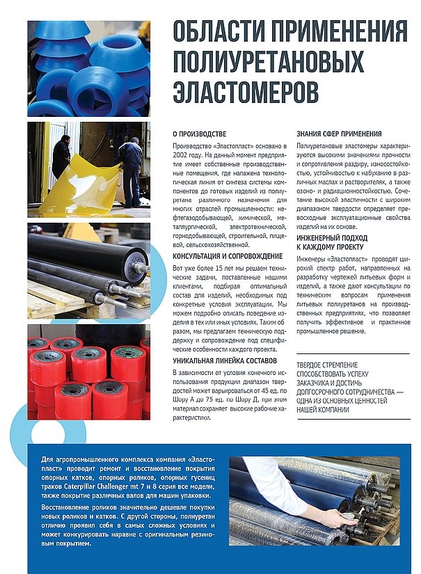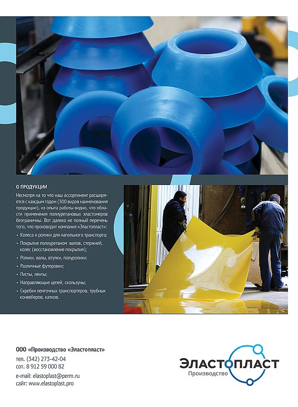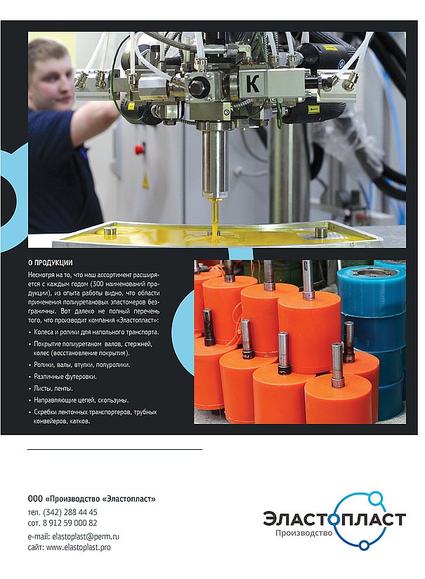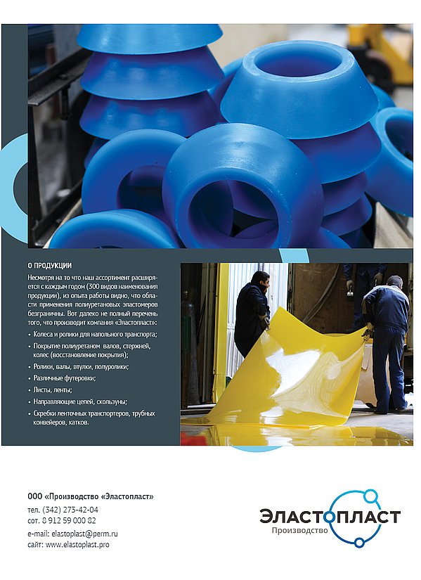 ООО «Эластопласт» основано в 2002 году. Учредители предприятия выходцы из ИТХ РАН (Институт технической химии Российской академии наук). На данный момент предприятие имеет собственные производственные помещения, где налажена технологическая линия от синтеза форполимера (преполимера) до готовых изделий из полиуретана различного назначения для многих отраслей промышленности: нефтегазодобывающей, химической, металлургической, электротехнической, горнодобывающей, строительной, пищевой, сельскохозяйственной и автомобильной. Мы используем только качественное импортное сырье фирм Dow Chemical Co. и "Bayer International S.A."