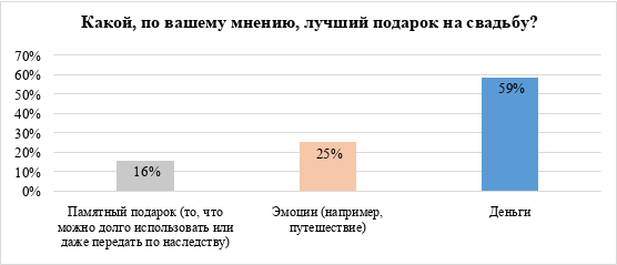 В отношении желаемого подарка на свадьбу большинство опрошенных выбрали деньги - 59%. На втором месте – нечто, что подарит незабываемые эмоции и навсегда оставит яркие воспоминания, например, свадебное путешествие. Такой вариант предпочли 25% респондентов. Ещё 16% россиян хотят памятные подарки, которые можно было бы передать по наследству.