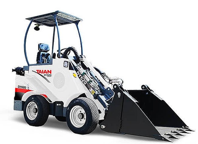 - Taian DY620 — компактная и манёвренная модель с телескопической стрелой, грузоподъёмностью 800 кг и максимальной высотой подъёма до 2750 мм. Весит около 1100 кг, оснащён дизельным двигателем Kubota мощностью 25 л.с. и гидростатическим приводом, обеспечивающим скорость до 10 км/ч. Мини-погрузчик отлично подходит для работ в условиях ограниченного пространства благодаря небольшому радиусу поворота (1980 мм) и высокой маневренности 1 4 1.